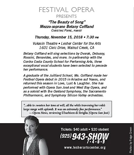 Acclaimed mezzo-soprano Betany Coffland will perform a recital program featuring works by Dvorak, Debussy, Rossini, Benavides and more, with piano accompaniment by Christine Payne. One performance only, in the Vukasin Theatre. In partnership with the Contra Costa County School for Performing Arts, three exceptional vocal students have been selected to precede her performance.